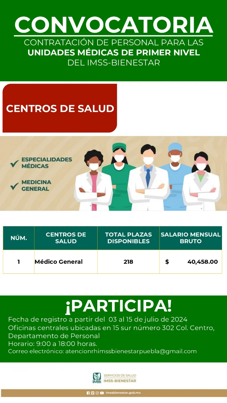 Con el objetivo de fortalecer la operación de los hospitales en beneficio de las y los poblanos, el gobierno presente de Sergio Salomón, a través de los Servicios de Salud IMSS-Bienestar en Puebla, oferta vacantes para médicas y médicos generales y especialistas en anestesiología, ginecología y obstetricia cirugía general, pediatría y medicina interna