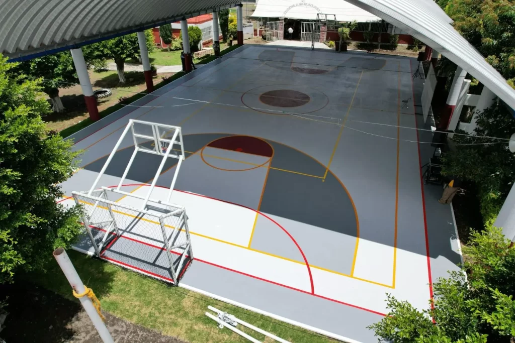 La obra incluye 608 m² de piso de concreto, instalaciones para deportes múltiples y áreas verdes con bugambilias, promoviendo un entorno saludable y seguro.