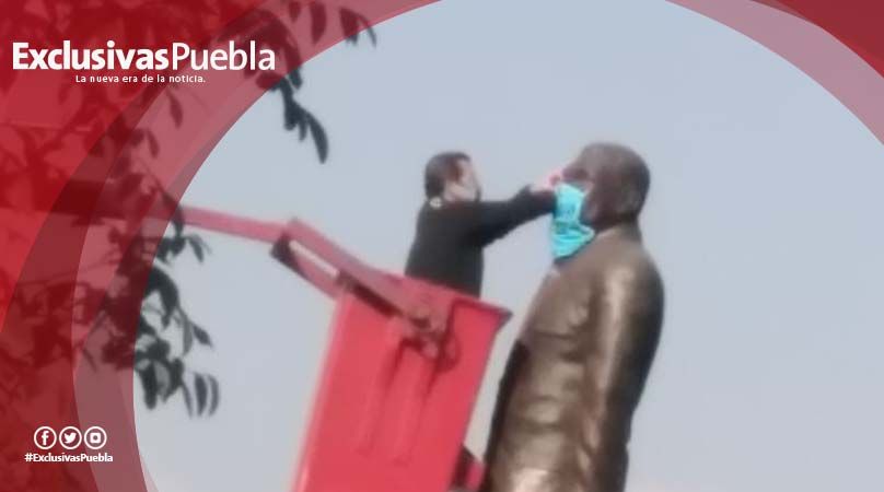 El alcalde de San Pedro Cholula, Luis Alberto Arriaga, colocó un cubrebocas en el monumento dedicado al doctor Alfredo Toxqui en el zócalo de la ciudad, como parte de una campaña de concientización social para el uso de este aditamento protector ante la pandemia de Covid-19.