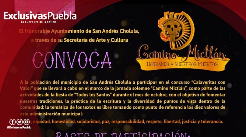 De igual forma, “Calaveritas con Valor” está dirigido a toda la población de San Andrés Cholula. Es necesario ser habitante de alguna junta auxiliar o inspectoría del municipio, y podrán inscribir hasta tres trabajos originales por participante que deberán ser de su autoría y en una extensión máxima de 1 cuartilla. Todos los trabajos serán enviados al correo electrónico espaciosculturales.cholula@gmail.com a más tardar el 30 de octubre a las 12:00 horas.