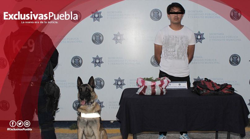 En acción efectiva, la Secretaría de Seguridad Pública y Tránsito Municipal (SSPTM) detuvo en la Central de Autobuses de Puebla (CAPU) a Eduardo “N.”, de 24 años de edad, por delitos contra la salud. Policías Municipales adscritos a la Unidad Canina efectuaban un recorrido de vigilancia en pasillos del lugar, cuando un ejemplar canino especializado en la detección de narcóticos modificó su comportamiento frente a un individuo. En consecuencia y conforme al protocolo de actuación policial, los elementos procedieron a inspeccionar el contenido de una mochila, hallando en su interior una bolsa de plástico que contenía hierba verde con características a la marihuana. Ante ello, se procedió a la detención del varón y al aseguramiento del estupefaciente, cuyo peso superaba los 700 gramos. Eduardo “N.” fue puesto a disposición del Ministerio Público para las investigaciones correspondientes. La SSPTM de Puebla refuerza la presencia policial en centrales camioneras de la ciudad, con el objetivo de inhibir el tránsito de sustancias ilegales que pongan en riesgo la salud de niños y jóvenes capitalinos.