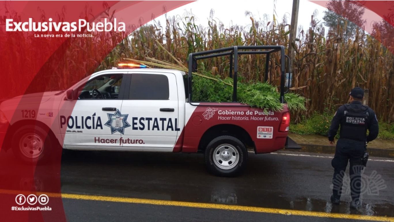 Agentes de la Policía Estatal localizaron y aseguraron plantas de hierba con apariencia de la marihuana en un terreno baldío.