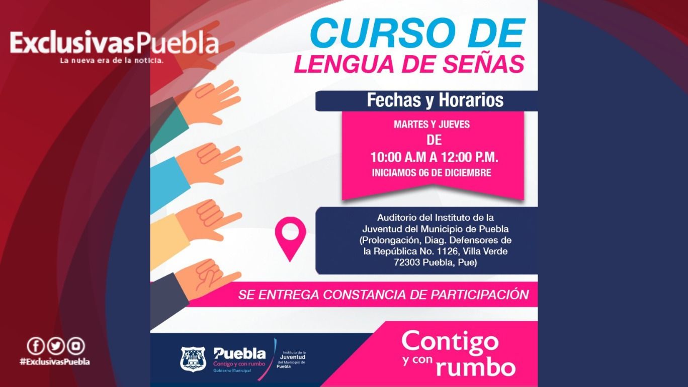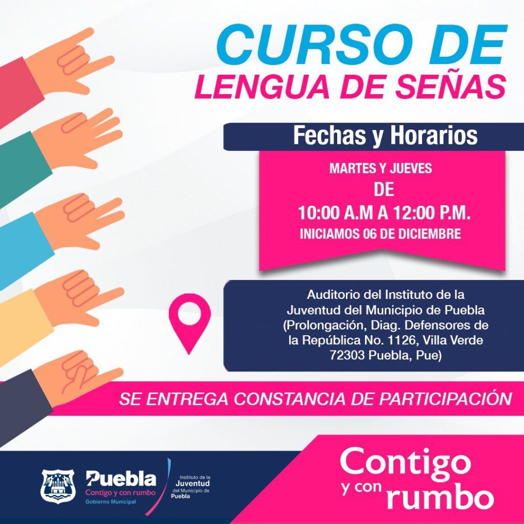 Para mejorar la calidad de vida de las personas, el Ayuntamiento de Puebla que encabeza Eduardo Rivera Pérez, a través del Instituto de la Juventud del Municipio (IJMP) abre el curso “Lengua de señas”, que comenzará el martes 6 de diciembre.