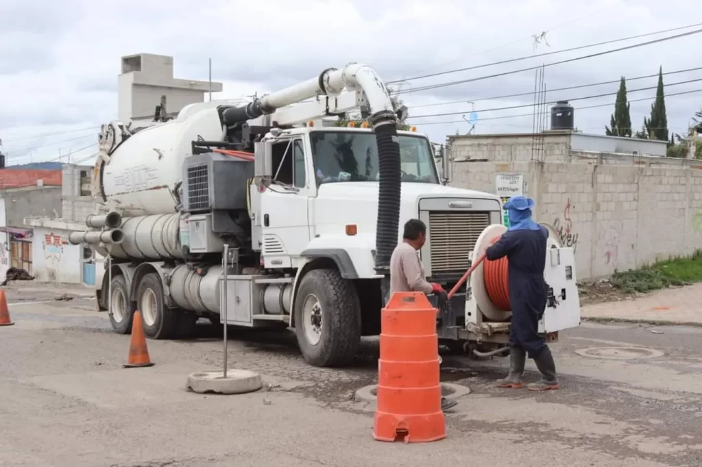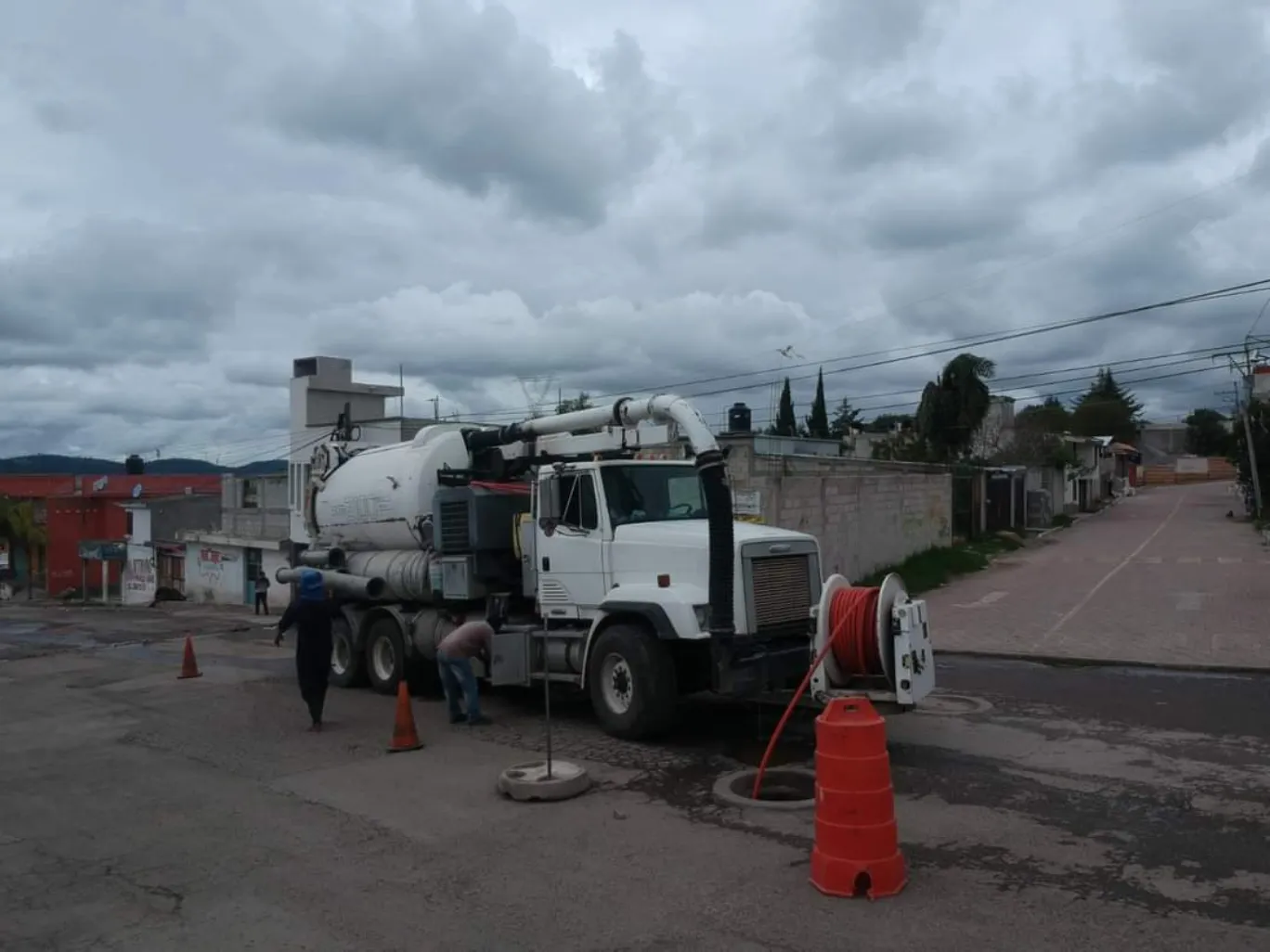Por instrucciones del alcalde Mario de la Rosa Romero, personal de Obra Pública de Amozoc realiza trabajos de desazolve y limpieza de drenajes con apoyo de la maquinaria vactor.