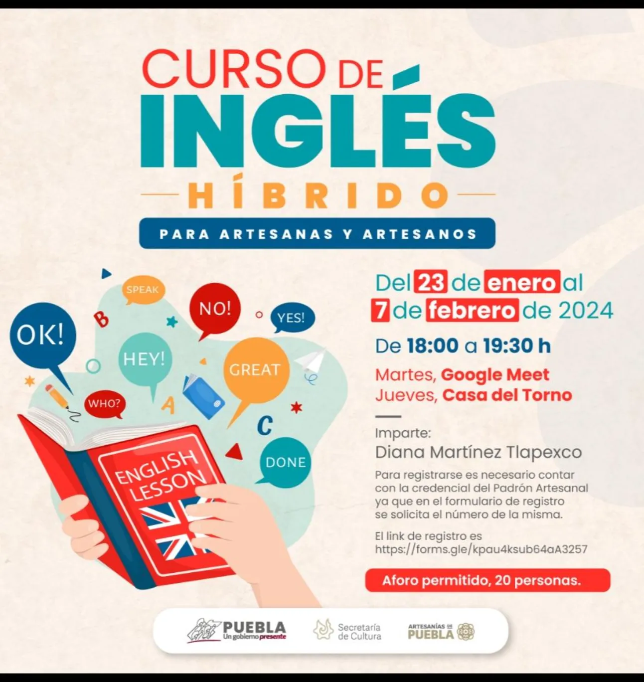 Para impulsar la comercialización de productos elaborados en el estado, el gobierno presente de Sergio Salomón, mediante la Secretaría de Cultura, brindará dos cursos gratuitos del idioma inglés, dirigidos a artesanas y artesanos que estén inscritos en el Padrón Artesanal de la dependencia.