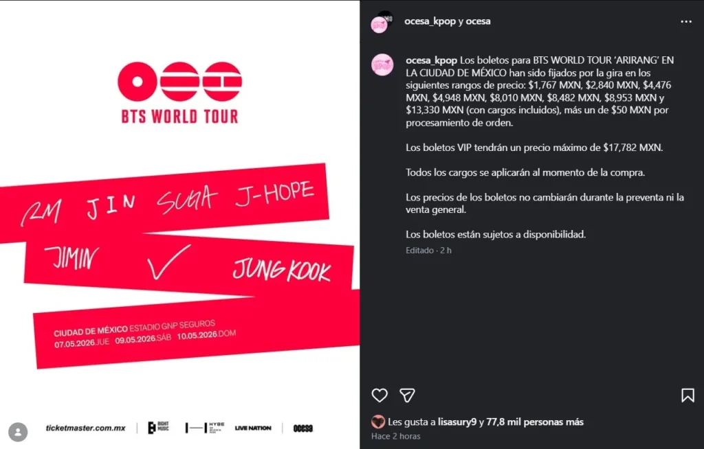 Tras semanas de expectativas entre el colectivo ARMY, Ocesa, Ticketmaster y PROFECO, finalmente se dieron a conocer los precios oficiales de los boletos para los conciertos que el grupo surcoreano ofrecerá en el Estadio GNP Seguros como parte de su gira mundial de reencuentro en 2026.