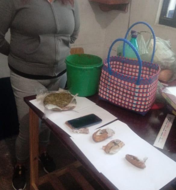 En la inspección, los uniformados encontraron cinco paquetes enredados con cinta canela que contenían hierba seca con apariencia de la marihuana, que en suma pesaron 417 gramos, así como un teléfono celular con dos tarjetas sim, por lo que la mujer fue detenida y puesta a disposición de las autoridades ministeriales.