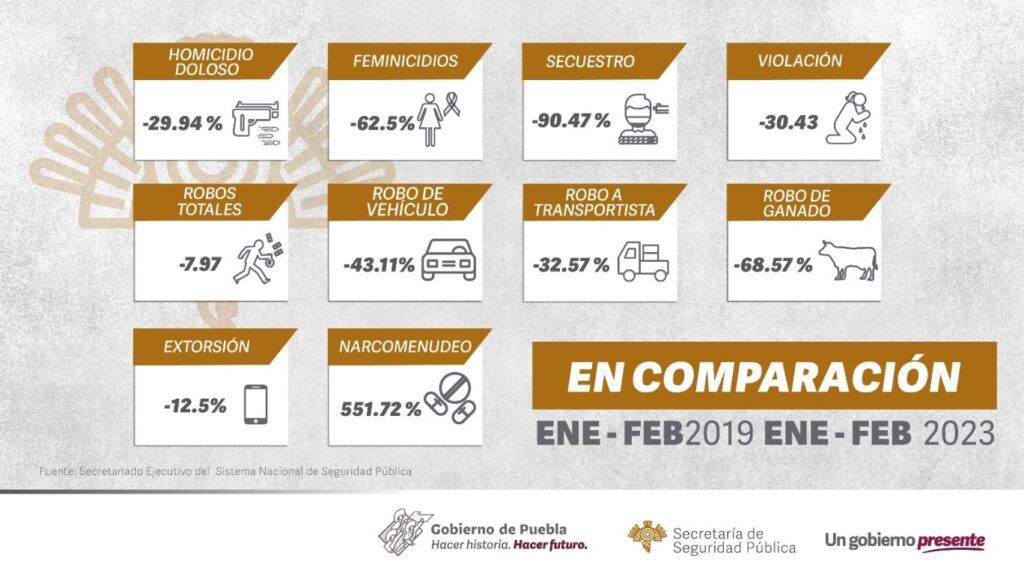 Como resultado de la implementación del Plan Estratégico Por Puebla “Paz, Seguridad y Justicia”, instruido por el gobernador Sergio Salomón, durante el primer bimestre de 2023 la entidad registró una reducción en la incidencia delictiva de nueve delitos de alto impacto, en comparación con el mismo periodo de 2019, informa la Secretaría de Seguridad Pública (SSP).