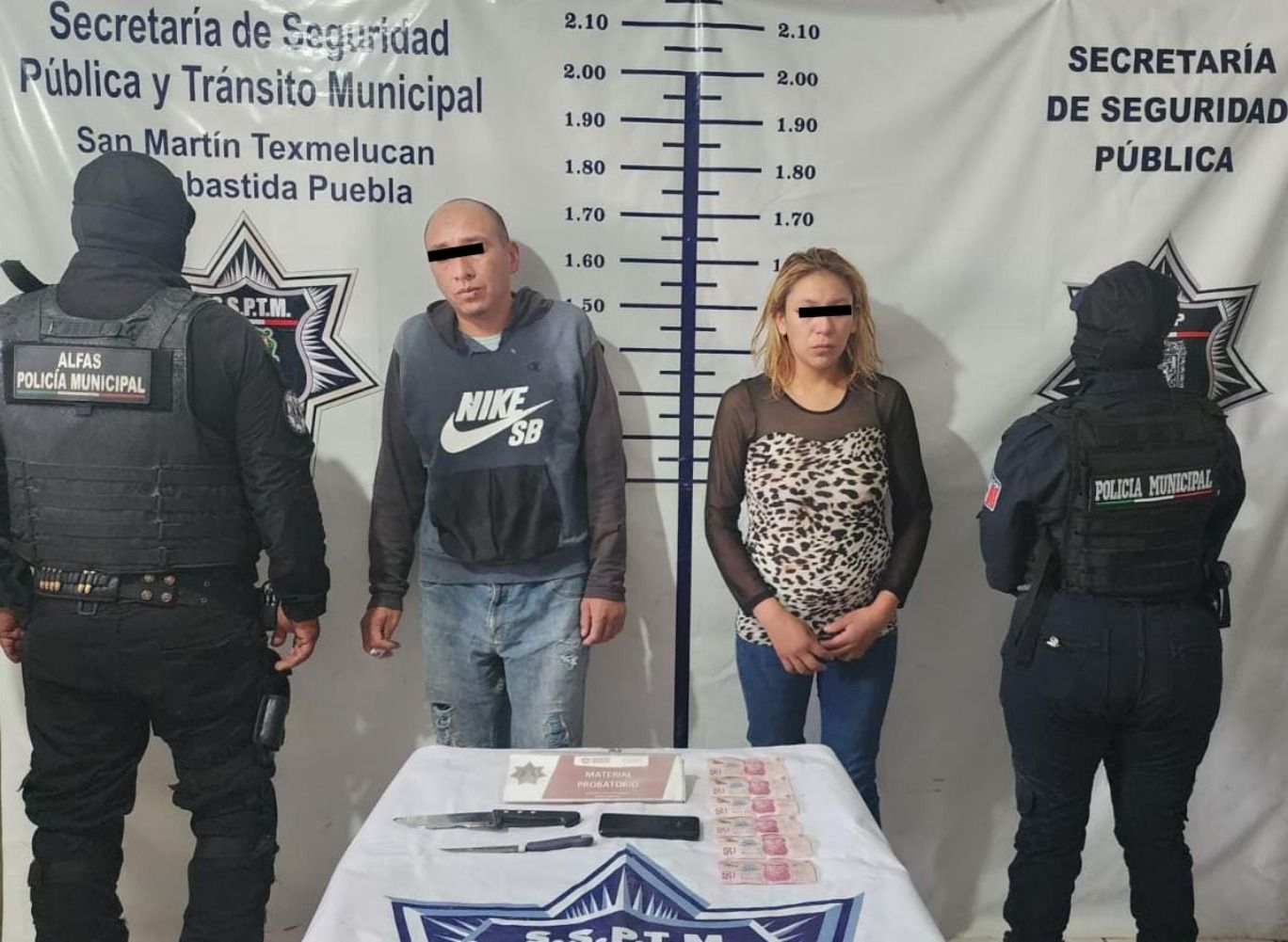 Los elementos de la policía municipal se trasladaron al lugar y al llegar observaron a varias personas rodeando a un masculino y una femenina. En ese momento una mujer se acercó y les dijo a los policías que los dos le habían quitado un celular y dinero en efectivo amenazándola con cuchillos.