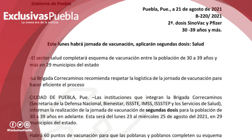 Las instituciones que integran la Brigada Correcaminos (Secretaría de la Defensa Nacional, Bienestar, ISSSTE, IMSS, ISSSTEP y los Servicios de Salud), informan la realización de la jornada de vacunación de segundas dosis para la población de 30 a 39 años en adelante.