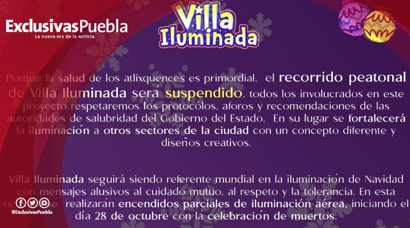 El ayuntamiento de Atlixco, publicó en redes sociales la determinación de cambiar el formato de la Villa Iluminada 2020 que este año no contempla recorridos presenciales los cuales serán suspendidos por la pandemia de Covid-19.