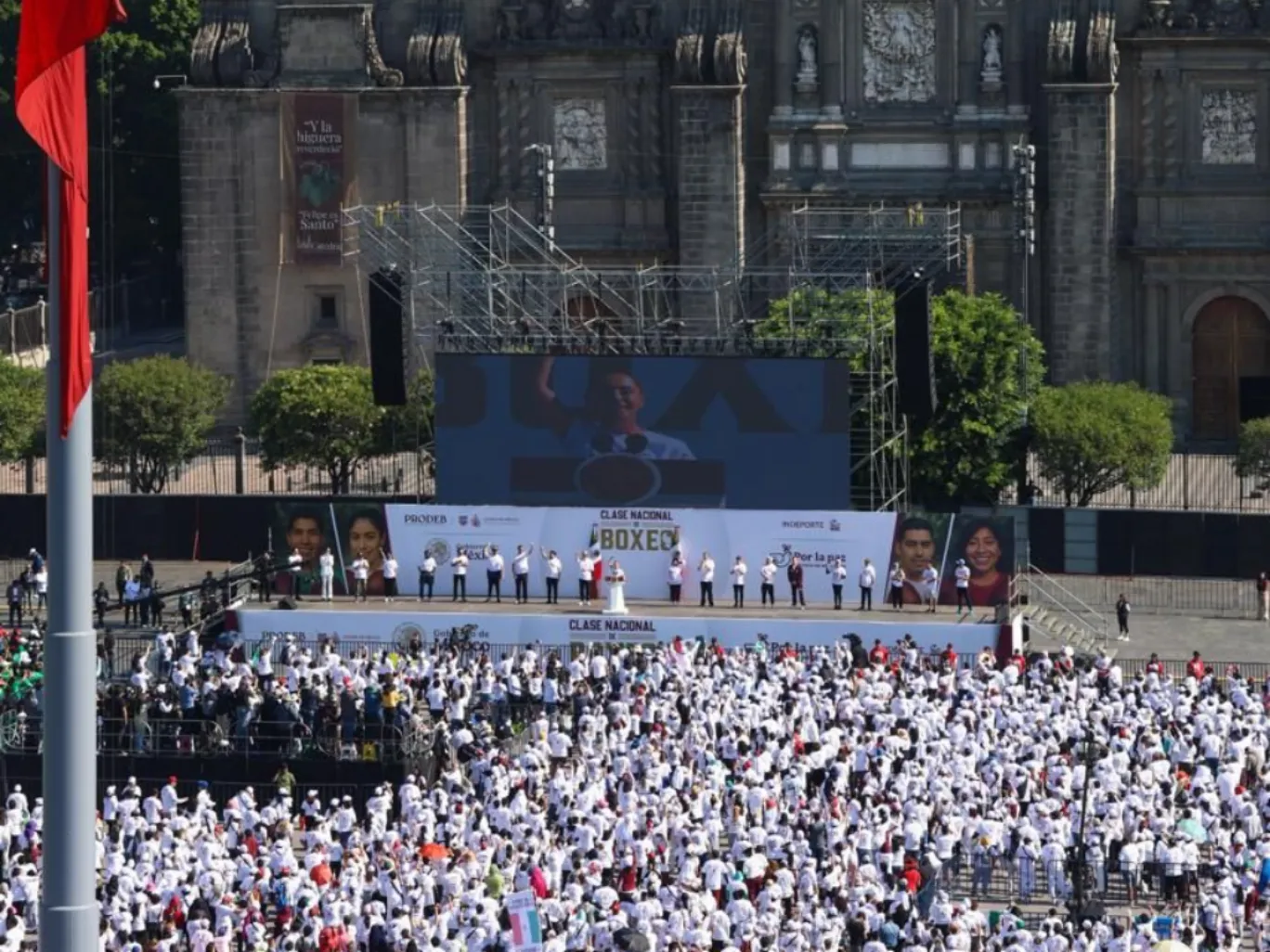 Ante 42 mil mexicanos y mexicanas de todas las edades, quienes pintaron de verde, blanco y rojo, la plancha del Zócalo capitalino para la Clase Nacional de Boxeo, destacó que esta actividad muestra que México es un país que dice: sí a la educación, al deporte, a la paz y al amor.