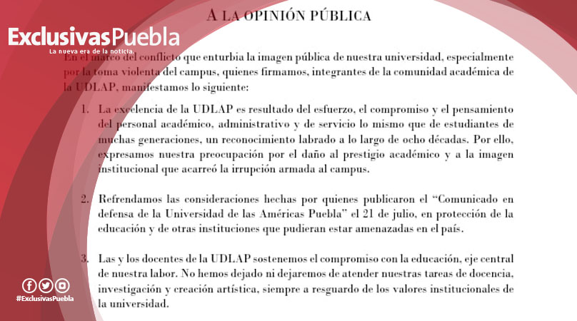 El resto del desplegado es el siguiente: “En el marco del conflicto que enturbia la imagen pública de nuestra universidad, especialmente por la toma violenta del campus, quienes firmamos, integrantes de la comunidad académica de la UDLAP, manifestamos lo siguiente: