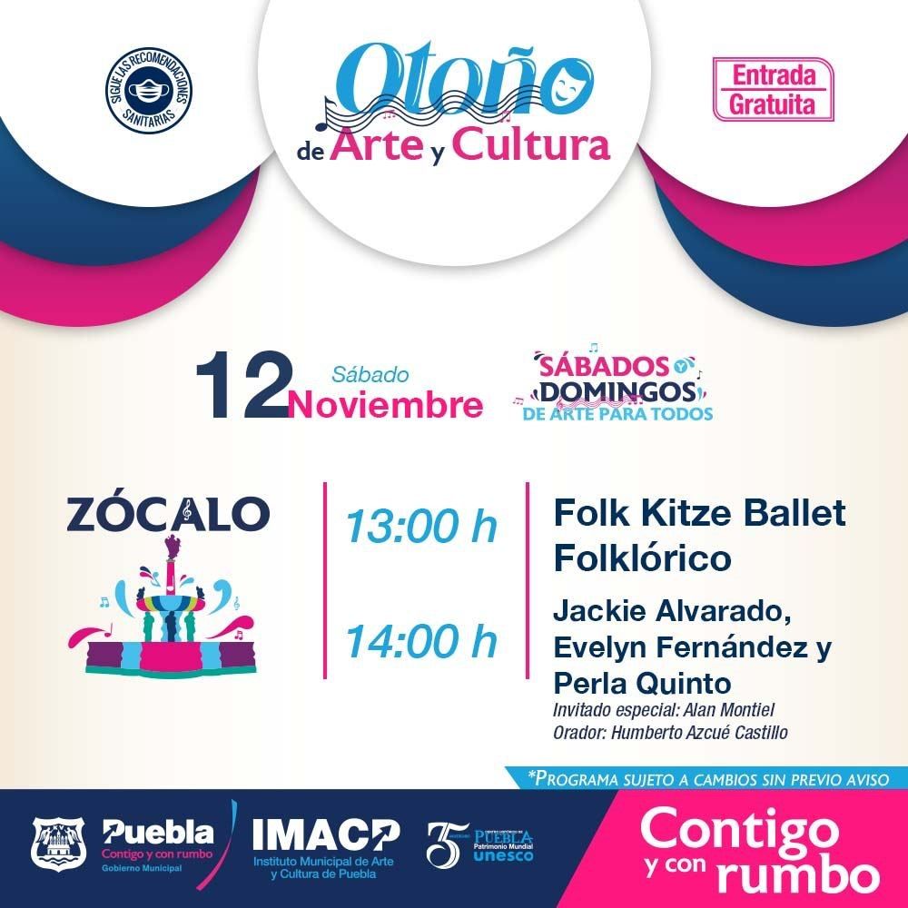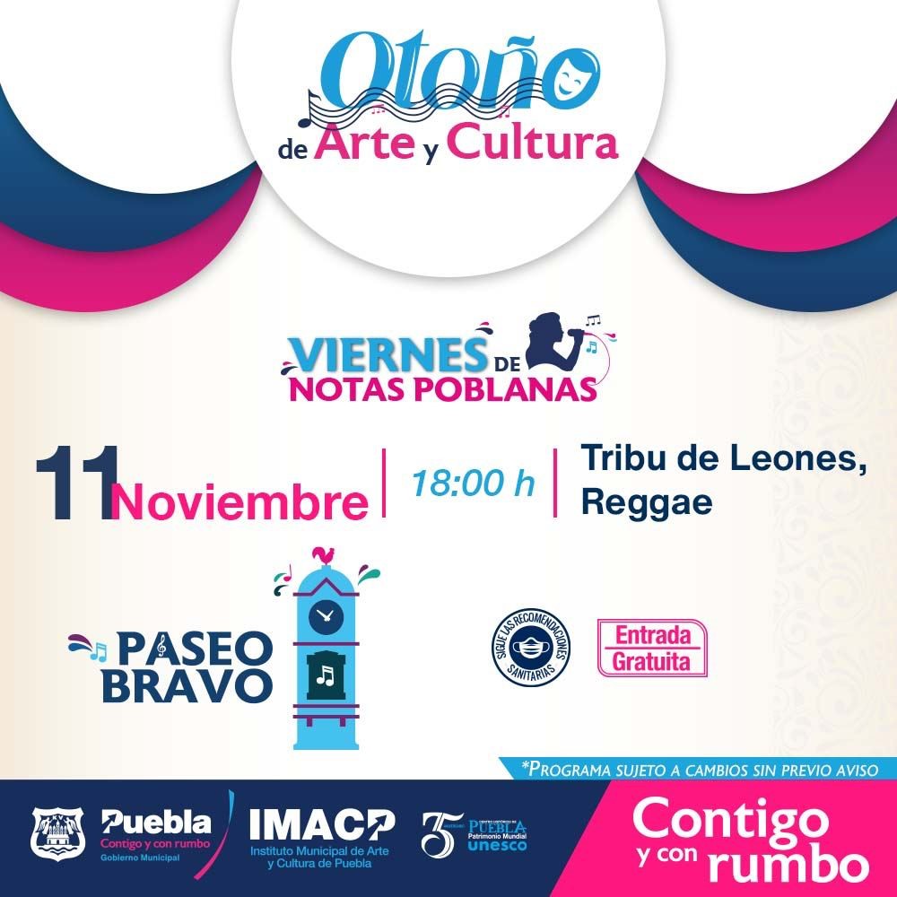 Las y los poblanos podrán alegrar su tarde con el “viernes de notas poblanas” a cargo de la agrupación de reggae “Tribu de Leones”, a las 18:00 horas; este mismo 11 de noviembre como parte del Festival de Cine ” Cineketon-cine y Arquitectura”, en el Teatro de la Ciudad a las 07:00 de la noche se proyecta la cinta “Plan para nuevos aires” de Gerardo Panero.