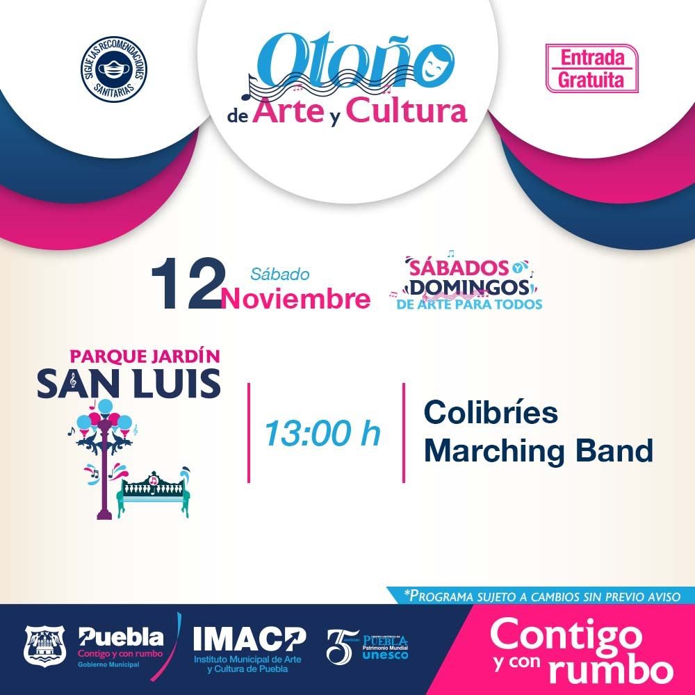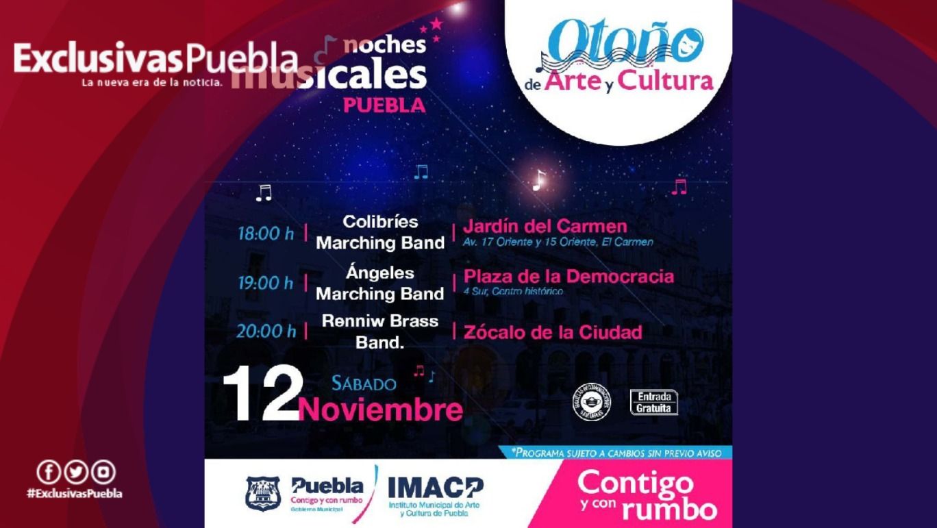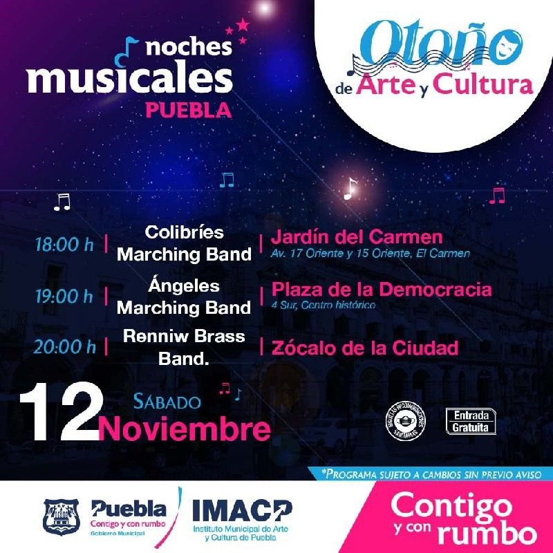 Este 12 de noviembre el IMACP invita a deleitarse con el programa de “Noches Musicales”, a las 18:00 horas de Colibríes Marching Band en Jardín del Carmen; a las 19:00 horas se presenta Ángeles Marching Band en la Plaza de la Democracia y a las 20:00 horas Renniw Brass Band tocará en el Zócalo de la Ciudad.