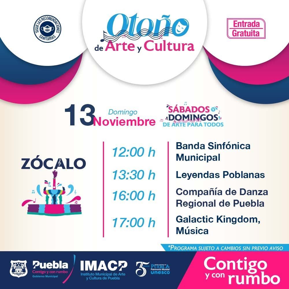 El 13 de noviembre vibrará el Zócalo en punto de las 12:00 horas con la Banda Sinfónica Municipal con su presentación de cada domingo, para dar paso a la presentación de Leyendas Poblanas, continuando con la Compañía de Danza Regional Puebla, cerrando el día con el Concierto de Galactic Kingdom a las 17:00 horas.