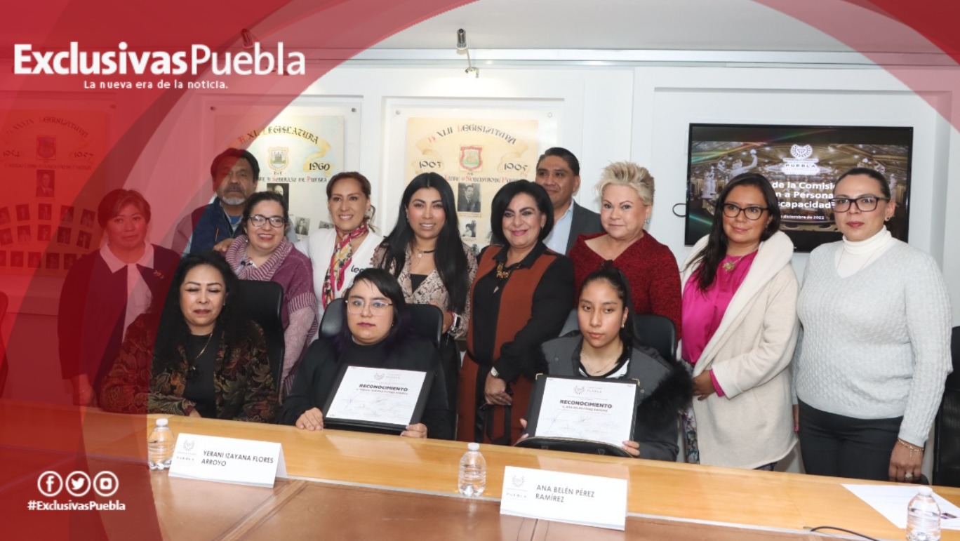 Integrantes de la Comisión de Atención a Personas con Discapacidad de la LXI Legislatura del Congreso del Estado entregaron un reconocimiento a las ciudadanas Yerani Izayana Flores Arroyo y Ana Belén Pérez Ramírez, quienes padecen discapacidad y han logrado superarse como artista plástica la primera y como atleta la segunda en diferentes escenarios en Puebla.