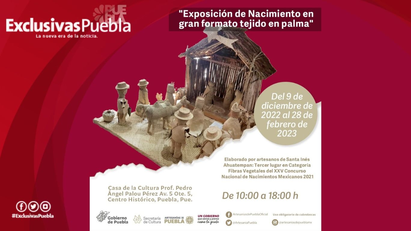 Con el fin de preservar las artesanías poblanas, la Secretaría de Cultura expondrá un nacimiento navideño en gran formato de figuras tejidas en palma en la Casa de la Cultura “Profesor Pedro Ángel Palou Pérez” (5 Oriente número 5, Centro Histórico).