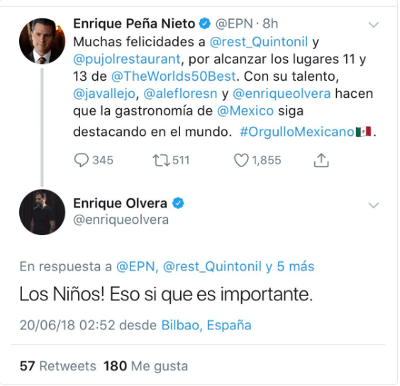 Este 19 de junio, la aclamada lista británica The World’s 50 Best Restaurants publicó su edición 2018, celebrando la diversidad de cocinas de alto nivel alrededor del mundo. Y México, una vez más, figuró en ella. Con dos grandes restaurantes, México tuvo presencia en este prestigioso reconocimiento internacional. El restaurante Quintonil, del chef Jorge Vallejo, se posicionó como el restaurante número 11 dentro de los 50 mejores del mundo. Avanzó 11 posiciones con respecto al año pasado. Y Pujol, de Enrique Olvera, que obtuvo el lugar número 13 dentro de los 50 mejores restaurantes del mundo. Avanzó siete posiciones con respecto al año anterior. Luego de darse a conocer la lista, el presidente Enrique Peña Nieto tomó su cuenta de Twitter para felicitar a los restaurantes y chefs por esta destacada distinción. Pero la respuesta de Olvera es la que se lleva los aplausos: “¡Los niños! eso sí que es importante”, fue lo que lo el gran chef le respondió a Peña Nieto. “Efectivamente… los niños. ¿Pero a quiénes se refiere exactamente Olvera? La decisión del gobierno de Donald Trump de procesar criminalmente a todo inmigrante que haya ingresado ilegalmente al país, por su nueva orientación de ‘tolerancia cero’, terminó por generar un drama con miles de niños mantenidos en albergues separados de sus padres.