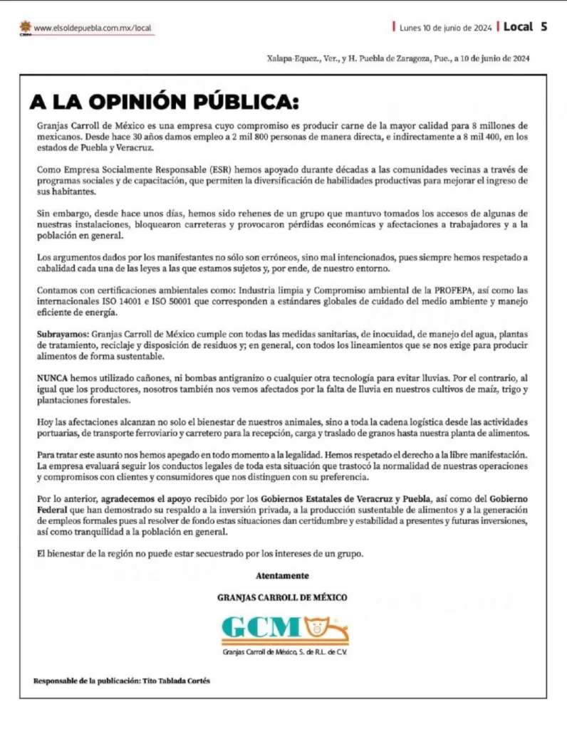 “Granjas Carroll de México cumple con todas las medidas sanitarias, de inocuidad, de manejo del agua, plantas de tratamiento, reciclaje y disposición de residuos. En general con todos los lineamientos que se nos exige para producir alimentos de forma sustentable”, expusieron.