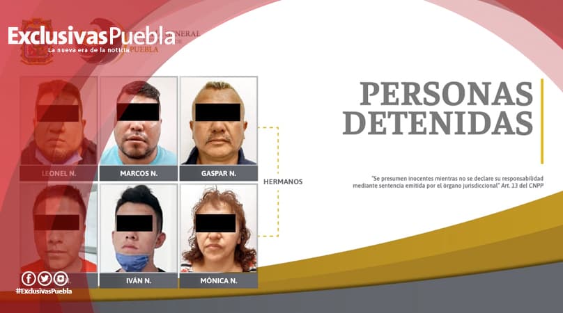 En la casa de seguridad de la localidad de Texcala, perteneciente al estado de Morelos, durante la intervención fueron detenidas siete personas originarias de Morelos: Gaspar N. de 45 años y su hermana Mónica N. de 48 años, Leonel N. de 31 años, Marcos N. de 29 años, Iván N. de 22 años, Gari N. de 21 años y un adolescente.