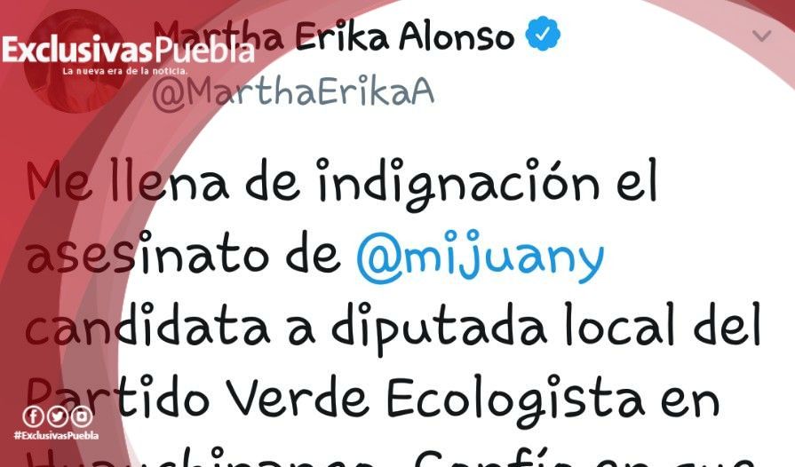 La candidata a gobernadora por la coalición “Por Puebla al Frente”, Martha Erika Alonso Hidalgo, lamentó el asesinato de Juana Iraís Maldonado Infante, candidata a diputada local por el Partido Verde Ecologista de México (PVEM).