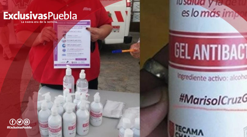 Marisol Cruz, presidenta de Tecamachalco, lucra con la contingencia sanitaria del COVID-19 al dejar ver sus intenciones para reelegirse en el 2021, pues aprovechó para salir a las calles a regalar botellitas de 100 mililitros de gel antibacterial, las cuales estaban rotuladas con su nombre y los colores de su partido (Morena).