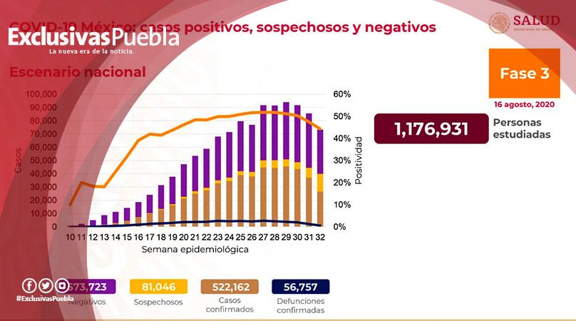 México alcanzó 522,162 casos positivos y 56,757 muertes causadas por el coronavirus, de acuerdo con el último reporte de la Secretaría de Salud.