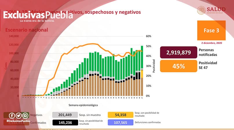 La Secretaría de Salud informó que el país acumula 1 millón 133,613 casos positivos y 107,565 muertes de personas con el coronavirus SARS-CoV-2, casi 4,000 de ellas en solo una semana