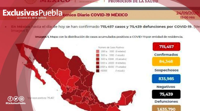 La Secretaría de Salud detalló que el país acumula 75,439 decesos y 715,457 contagios en los más de seis meses que lleva la pandemia