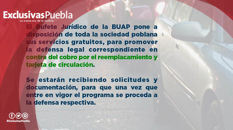 La Benemérita Universidad Autónoma de Puebla (BUAP) puso a disposición de los poblanos los servicios de su Bufete Jurídico, con la finalidad de ofrecer asesoría en cuanto a la defensa legal correspondiente en contra del cobro por el reemplacamiento y tarjeta de circulación.