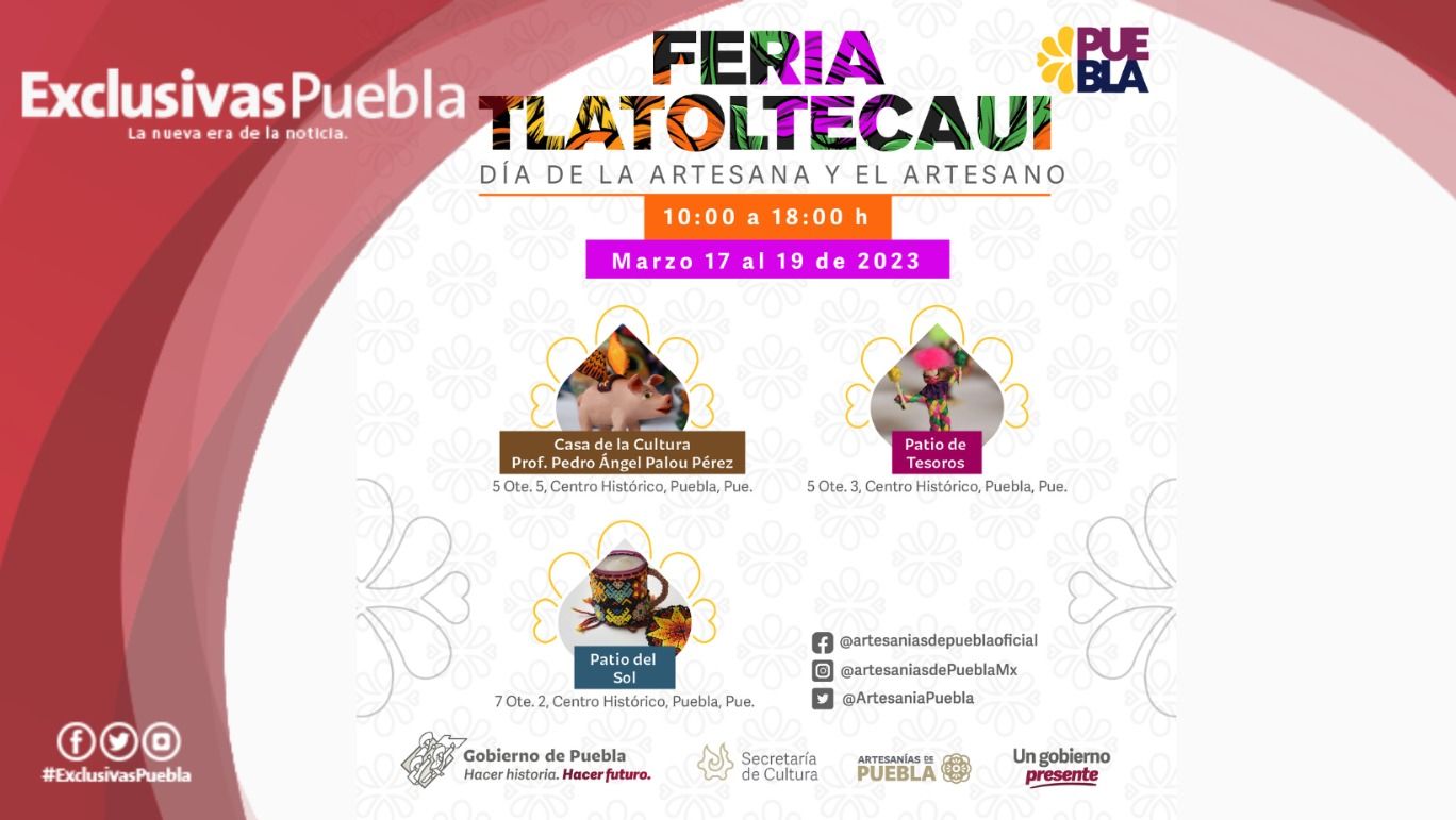 Para conmemorar el Día del Artesano (19 de marzo) y reconocer el trabajo realizado por los mismos, el gobierno de Puebla, a través de la Secretaría de Cultura, desarrollará la Feria Artesanal “Tlatoltecaui” del 17 al 19 de marzo en tres recintos del Centro Histórico.