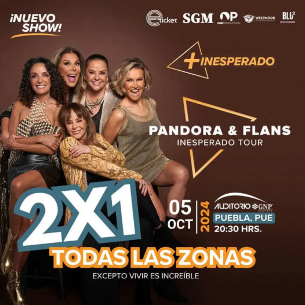 “+Inesperado Tour: Pandora & Flans” es un espectáculo sin precedentes, sin duda alguna. Todos los éxitos que han marcado a varias generaciones, en un solo concierto en el que las dos agrupaciones femeninas más icónicas de la música en español de los últimos tiempos fusionan su talento para lograr una inolvidable comunión con el público.