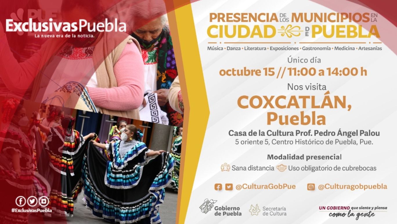 Como parte del programa “Presencia de los municipios”, la Secretaría de Cultura presentará muestras artesanales y artísticas de Coxcatlán el próximo 15 de octubre de 11:00 a 14:00 horas, en la Casa de la Cultura “Profesor Pedro Ángel Palou Pérez” (5 Oriente número 5, colonia Centro).