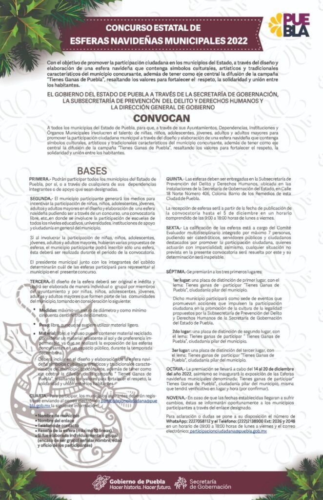 Para promover la participación ciudadana y resaltar los valores de respeto, solidaridad y unión, la Secretaría de Gobernación (SEGOB), a través de la Subsecretaría de Prevención del Delito y Derechos Humanos y la Dirección General de Gobierno, convoca a participar en el “Concurso Estatal de Esferas Navideñas Municipales 2022”,en el que a través del diseño y elaboración de dicha pieza, los ayuntamientos podrán promover su cultura, arte y tradiciones, además de tener como eje central la difusión de la campaña ”Tienes Ganas de Puebla”.
