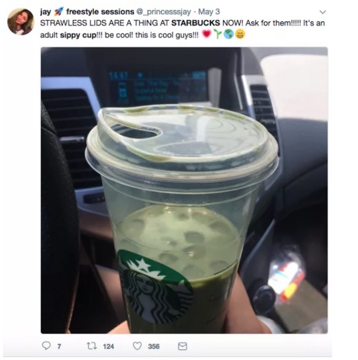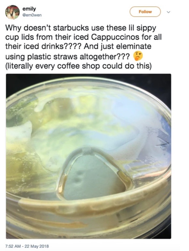 - “¿Por qué Starbucks no usa estas tapas sin popote para sus capuchinos helados para todos sus tragos con hielo y sólo eliminan usar pajitas de plástico al mismo tiempo? (Literalmente todas las tiendas de café deberían hacer esto)”.