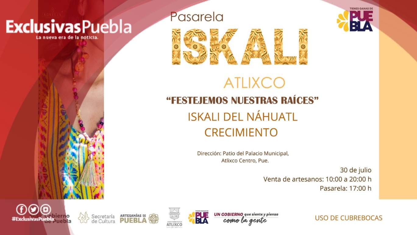 A fin de visibilizar y difundir el valor de la producción de ropa en el interior del estado, la Secretaría de Cultura realizará la pasarela de moda artesanal “ISKALI ATLIXCO. Festejemos nuestras raíces”, el 30 de julio a las 17:00 horas en el patio del Palacio Municipal de dicha demarcación.