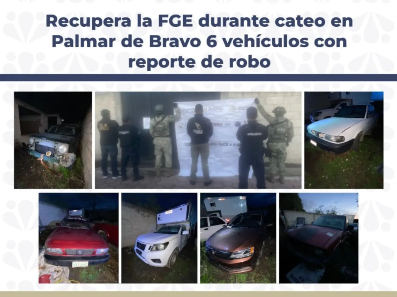 Como resultado de un cateo realizado por la Fiscalía General del Estado, con apoyo de la Secretaría de la Defensa Nacional y elementos de la Policía Municipal, se logró recuperar en el municipio de Palmar de Bravo, Puebla, seis vehículos que cuentan con reporte de robo.