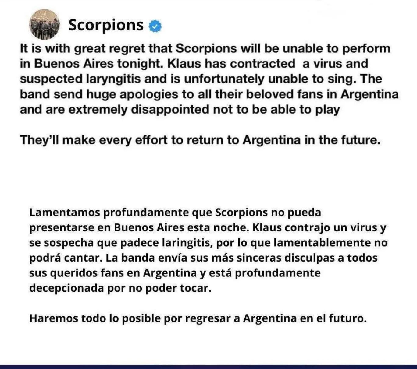 Scorpions anunció recientemente en sus redes sociales que su concierto en Buenos Aires había sido cancelado debido a que el vocalista Klaus Meine había contraído un virus y se sospechaba que padecía laringitis.