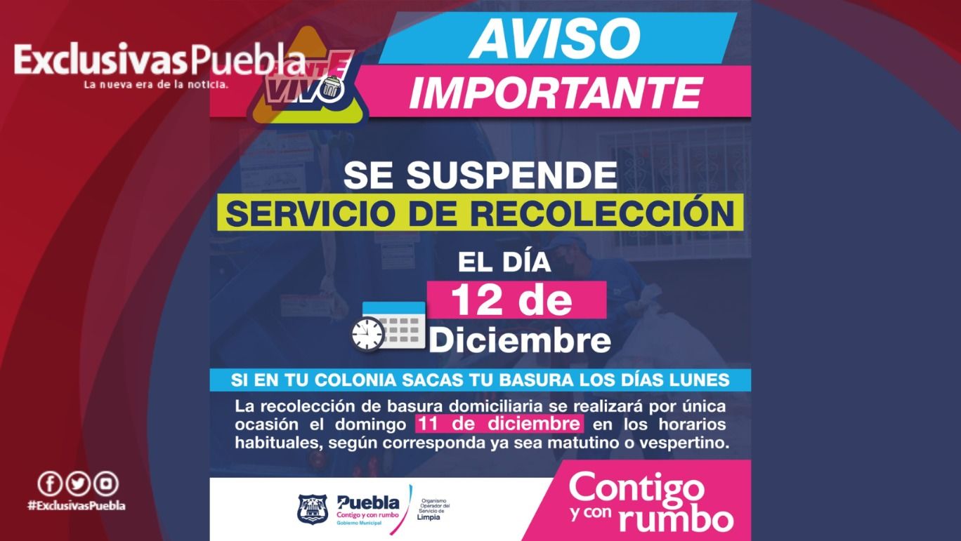 Con motivo del “Día de las y los Trabajadores del Servicio de Limpia”, el Ayuntamiento de Puebla informa que se suspenderá la recolección domiciliaria el próximo 12 de diciembre, misma que se hará por única ocasión el domingo 11 de diciembre.