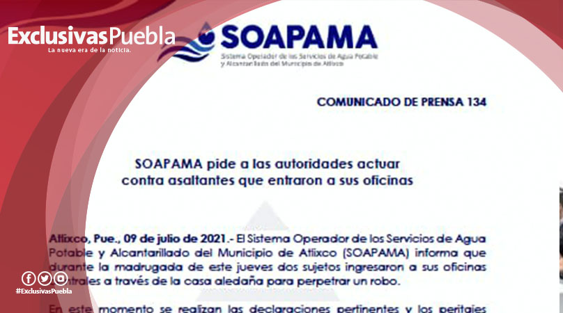 El Sistema Operador de los Servicios de Agua Potable y Alcantarillado del Municipio de Atlixco (SOAPAMA) informa que durante la madrugada de este viernes dos sujetos ingresaron a sus oficinas centrales a través de la casa aledaña para perpetrar un robo.