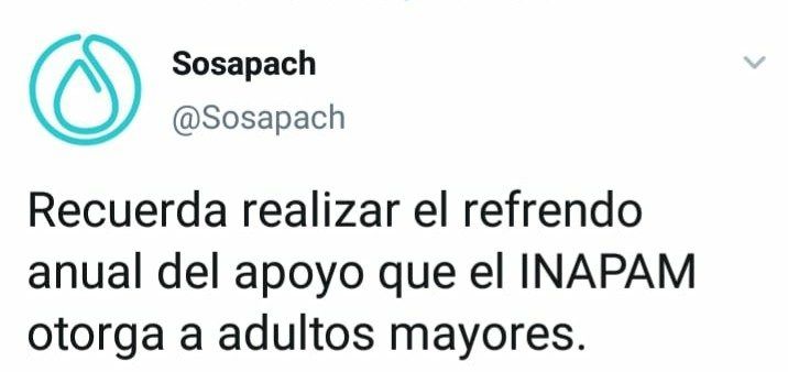 El Sistema Operador de Agua Potable y Alcantarillado del municipio, invita a los adultos mayores para realizar el refrendo anual del apoyo que se otorga con descuento del 50 por ciento en el pago de la tarifa del servicio.