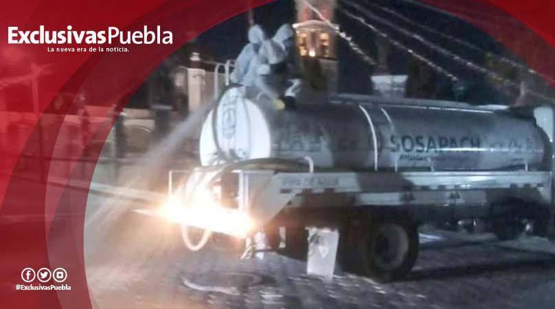 Ahora brigadas del Sistema Operador de Agua Potable y Alcantarillado de San Pedro Cholula están sanitizando calles de barrios y juntas auxiliares en prevención de la pandemia de Covid-19.