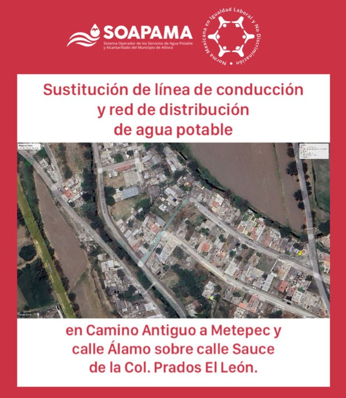 Para mejorar el suministro del vital líquido, el Sistema Operador de los Servicios de Agua Potable y Alcantarillado del Municipio de Atlixco (SOAPAMA), realiza la sustitución de 100 metros de línea de conducción y 100 metros de red de distribución de agua potable, ambas con tubería lisa de polietileno de alta densidad de 3 pulgadas de diámetro, así como la sustitución de 15 tomas domiciliarias en Camino Antiguo a Metepec y calle Álamo sobre calle Sauce de la Colonia Prados El León.