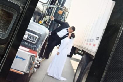 En medio del bloqueo registrado en la México-Puebla, una pareja de recién casados aprovechó el momento para tomarse una sesión de fotos