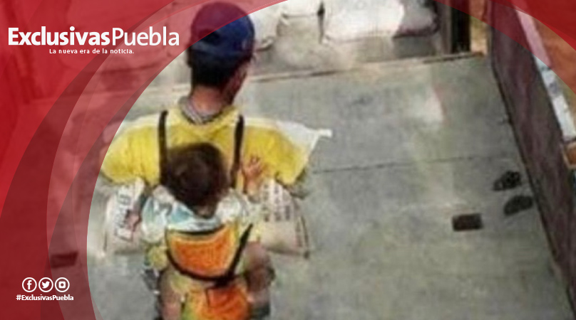 Éste es el caso de este trabajador de la construcción que día a día carga a su hijo a sus espaldas para no dejarlo solo.